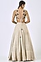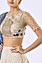 Featuring an ivory lehenga in chanderi jacquard and net base with sequin and bead embroidery. It is paired with a matching blouse and a contrasting blue stole.