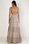 Featuring a light taupe gown in opera silk base with cutdana, pearl, and sequins hand embroidery. It has net sleeves with fringe detailing.