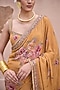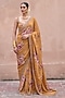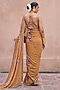 Featuring a mustard saree in crepe base with print and hand embroidery. It is paired with an embroidered blouse and an underskirt. Accentuate it with gold jewelry and heels, perfect for pooja ceremony, haldi functions or festive occasions.