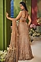 Featuring a copper gold fish cut lehenga in net base with geometric motifs embroidery. It is paired with a sleeveless blouse and a drape dupatta. Accentuate with heavy jewellery set and heels for wedding, cocktail or engagement ceremonies.