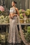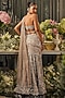 Featuring a nude grey pre-draped skirt saree in net base with sequins, crystals, cutdana and geometric motifs embroidery. It is paired with a halter neck blouse and an embellished saree drape. Accentuate with heavy jewellery set and heels for wedding, cocktail or engagement ceremonies.
