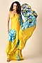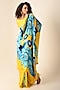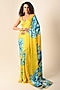 Featuring a yellow saree in satin georgette base with digital print and satin border detail. It is paired with an unstitched blouse. Accentuate it with statement jewellery and heels for a wedding or haldi ceremony.