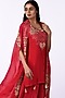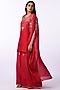 Featuring a crimson red jacket in viscose and georgette base with resham and zari embroidery. It is paired with a raw silk kurta having floral thread work and satin palazzo pants. Accentuate it with silver earrings and stiletto heels for a refined ensemble, ideal for sangeet ceremonies or festive gatherings.