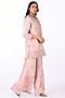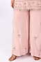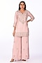 Featuring a peach kurta in raw silk base with thread hand embroidery. It is paired with crepe wide-leg palazzo pants and a viscose organza dupatta. Accentuate it with statement chandbali earrings and an embellished juttis for a refined ensemble, ideal for festive wear, pooja or light celebrations.
