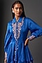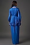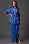 Featuring a blue top in organza base with embroidery. It is paired with a bustier and a pure satin skirt. Accentuate it with minimal jewellery and heels for a festive or sangeet ceremony.