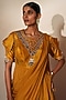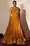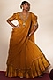 Featuring a golden yellow anarkali in silk and organza base with dori-marodi and jadau hand embroidery, including draped sleeves and asymmetric hemline. It is paired with an organza skirt and dupatta. Perfect for receptions, festive soirees, or evening celebrations, this ensemble captures the artistry of heritage couture reimagined for woman.