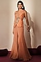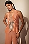 Featuring a metallic mocha waistcoat in silk base with dori marodi, dabka, patchwork, zardosi and stone hand embroidery. It is paired with georgette sharara pants. Perfect for cocktail evenings, mehndi celebrations, or destination weddings, this ensemble embodies heritage opulence with contemporary ease.