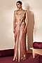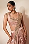 Featuring a metallic soft pink pre-draped saree in chiffon satin base wit dori-marodi, 3D cutwork and jadau embellishments. It is paired with a silk hand embroidered blouse. Perfect for cocktail nights, receptions, or destination celebrations, this look captures the poetry of drape reimagined for today?s modern muse.