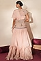 Featuring a metallic soft pink asymmetric draped jacket kurta in silk and organza base with embroidery. It is paired with flared sharara pants. Perfect for cocktail evenings, mehndi celebrations, or destination weddings, this ensemble embodies heritage opulence with contemporary ease.