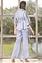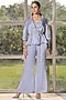 Featuring a periwinkle kimono top in organza and silk base with an embroidered collar. It is paired with a matching bustier, pants, and a hand braided belt.