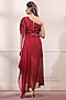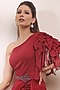 Featuring a ruby red one-shoulder dress in crepe lycra and georgette base with organza frills and a detachable flare.