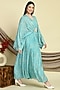 Featuring a turquoise gown in muslin base with digital print and an attached embroidered belt.