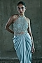 Featuring an ice blue top in organza base with stone hand embroidery. It is paired with satin skirt. Style it with statement jewellery and embellished heels for evening soirees.