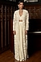 Featuring an ivory jacket in net and satin base with floral, geometrical motifs, sequins and pearl embellishments. It is paired with a draped skirt and an embroidered bustier. Accentuate it with statement jewellery and heels for elite cocktail parties.