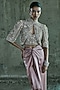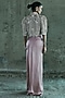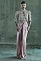 Featuring a rose gold short jacket in organza base. It is paired with a shimmering bustier and satin skirt. Style it with statement jewellery and embellished heels for wedding soirees.