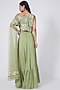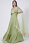 Featuring an olive green flared gown in crepe and organza base. It is paired with a matching cape having an attached dupatta and zardosi embroidery.