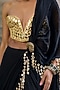 Featuring a black pre-draped saree in georgette base with jhalar latkan detailing. It is paired with a gold corset having mirror embroidery. Accentuate it with statement jewellery, a coordinated clutch and block heels for a stylish ethnic look, perfect for sangeet nights or cocktail parties.