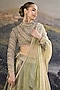 Featuring a black and green lehenga in tissue base. It is paired with an organza jadau blouse and an embroidered dupatta. Accentuate it with statement kundan or gold jewellery, a sleek bun and embellished heels for a regal ethnic look, perfect for wedding, engagement or sangeet ceremonies.
