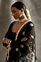 Featuring a black anarkali in pure georgette and mukaish base with hand embroidery. It is paired with matching churidar pants in lycra net base and a silk organza dupatta.