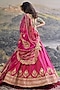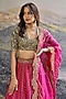 Featuring a fuchsia pink lehenga in crepe base with embroidery. It is paired with a turquoise silk embroidered blouse and an organza embroidered dupatta. Accentuate it with statement kundan or gold jewellery, a sleek bun and embellished heels for a regal ethnic look, perfect for wedding, engagement or sangeet ceremonies.