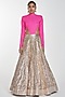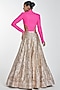 Featuring a gold lehenga in imported crepe base with gota patti and crystals embroidery. It is paired with a contrasting neon pink bodysuit.