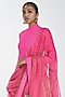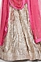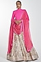 Featuring a gold lehenga in imported crepe base with gota patti and crystals embroidery. It is paired with a contrasting neon pink bodysuit and an organza dupatta.