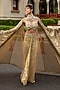 ITRH features a mesmerizing Gold Draped Skirt Set Gown that captivates with its elegance. The eye-catching skirt is crafted in net with crystal embellishments. It is paired with a bandeau having stone detail, a flowing cape and a stone embellished collar. Elevate your red carpet or evening ensemble with sophistication by accessorising with statement jewellery and heels.