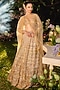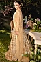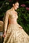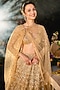 Featuring a gold lehenga in net base. It is paired with a blouse and a sheer dupatta. Accentuate it with statement kundan or gold jewellery, a sleek bun and embellished heels for a regal ethnic look, perfect for wedding, engagement or sangeet ceremonies.