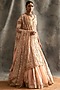 Featuring a peach lehenga in silk chanderi and lampi base with godet detailing. It is paired with a matching high slit kurta having chevron work and a silk organza dupatta with hand embroidery.