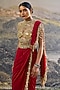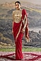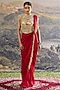 Featuring a red pre-draped paneled saree in georgette base with jhalar latkan detailing. It is paired with a gold mirror embroidered blouse and a mirror tassel t-shirt. Accentuate it with statement jewellery, a coordinated clutch and block heels for a stylish ethnic look, perfect for sangeet nights or cocktail parties.