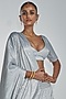 Featuring a silver lehenga in imported crepe base with crystals embroidery. It is paired with a matching blouse and a dupatta.