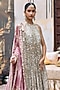 Featuring a silver lampi lehenga in hard net and soft net base. It is paired with a halter-neck tunic having mirror lace and pink tissue dupatta having mirror hand embroidery. Style it with statement jewellery, heels, and a clutch to elevate your look for weddings or festive celebrations.