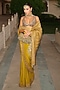 Featuring a yellow and purple saree in raw silk and cotton cambric base with embroidery. It is paired with an embroidered blouse. Accentuate it with dangler earrings and heels for a festive occasions, sangeet or wedding ceremonies.