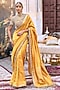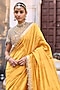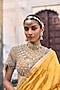 Featuring a yellow saree in raw silk, cotton, tussar and brocade base with embroidery. It is paired with an embroidered blouse. Accentuate it with dangler earrings and heels for a festive occasions, sangeet or wedding ceremonies.