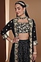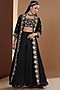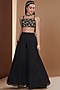 Featuring a black long jacket in silk base with hand embroidery. It is paired with a matching embroidered noodle strap blouse and chinon chiffon hand block printed sharara pants.