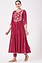 Featuring a cherry red crinkled anarkali in viscose georgette base with gota and sequins embroidery. It is paired with matching textured khadi ankle-length pants and a cotton mulmul dupatta.