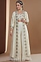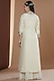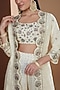Featuring an ivory long jacket in silk base with hand embroidery. It is paired with a matching hand embroidered noodle strap blouse and chinon chiffon sharara pants having hand block print.