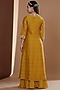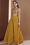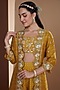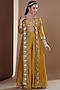 Featuring a mustard long jacket in silk base with hand embroidery. It is paired with a matching embroidered noodle strap blouse and chinon chiffon hand block printed sharara pants.