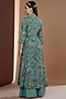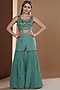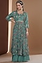Featuring a turquoise long jacket in chinon chiffon base with hand embroidery and floral digital print. It is paired with a matching printed blouse, gharara pants and an embroidered belt.