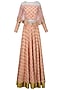 This set features a peach banarsi boota applique off shoulder blouse in georgette base. It is paired with matching banarsi applique brocade lehenga skirt and sheer cape in net base embedded with mirror work and dori embroidery along the hemline.