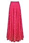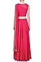 This set features a reddish pink mirror work sleeveless blouse in heavy georgette with an attached embellished dupatta. It has a round neckline and concealed zipper closure detailing on the side. It comes along with a red dori embroidered and sequinned skirt in georgette base.