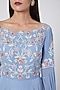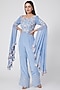 Featuring a blue jumpsuit in silk georgette and crepe base with bell sleeves and cutdana embroidery.