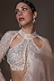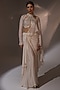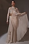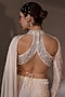 Featuring an egg white pre-draped saree in chinon, organza and shantoon base. It is paired with a blouse having an edgy cuts, aari and crystal hand embroidery. Style with diamond earrings, sleek heels and an embellished clutch for an effortlessly glamorous look. Perfect for cocktail parties, receptions, or evening celebrations.
