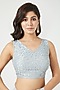 Featuring a powder blue draped saree in georgette and dupion base with ruffles, sequins, moti and swarovski embellishments. It is paired with a matching blouse and a belt.