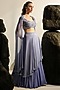 Featuring a purple skirt in crepe and georgette base with embroidery. It is paired with a matching blouse having scoop neck, smocked shoulder pads and an attached cape sleeves.