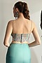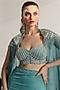 Featuring a tiffany blue cape in organza base with hand embroidery. It is paired with a matching crepe skirt and net corset blouse.