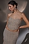 Featuring a vanilla white fish-cut lehenga in organza and shantoon base. It is paired with an embroidered corset. Style with diamond earrings, sleek heels and an embellished clutch for an effortlessly glamorous look. Perfect for cocktail parties, receptions, or evening celebrations.