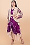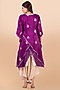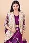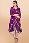Featuring a purple and golden layered top in banarasi silk base with boota work. It is paired with contrasting cream modal satin draped dhoti pants, a cutwork jacket, and a lacy belt.