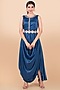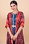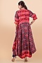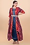 Featuring a red draped jacket in banarasi silk and modal satin base with patola print. It is paired with a contrasting blue draped dress and a lacy belt.