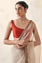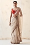 Featuring a champagne gold saree in pure organza base with embroidery. It is paired with an orange blouse and an underskirt. Accentuate with statement earrings and heels for a festive occasion.